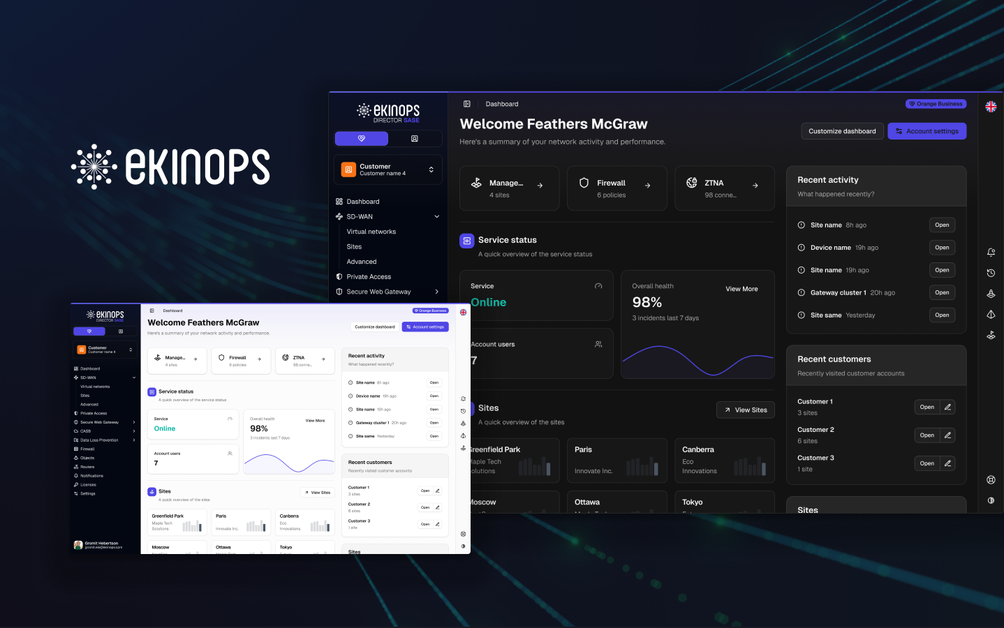 SD-WAN & networks admin platform with real-time charts, service health monitoring, site management, and customer dashboards built for enterprise-grade network operations.
